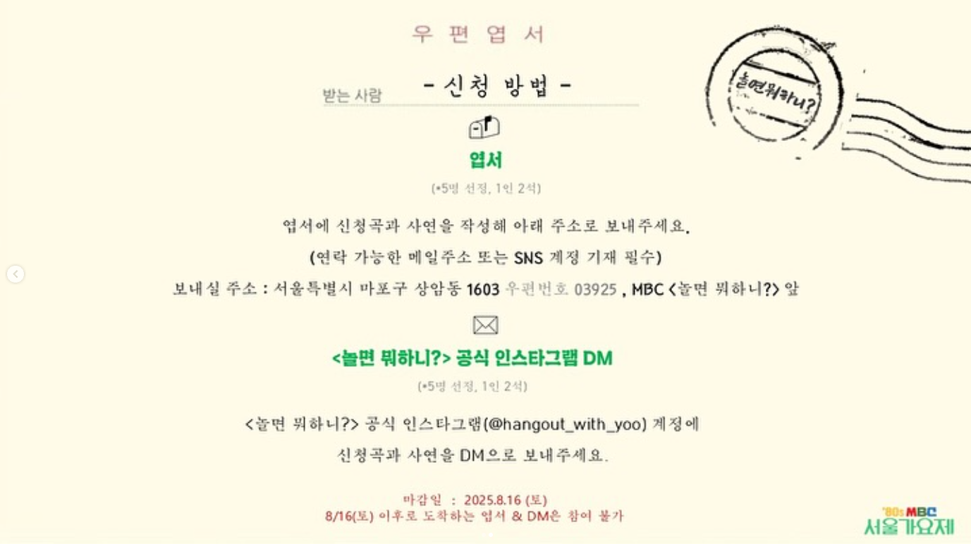 ✅ 경품: ‘80s MBC 서울가요제 초대권 2매 (10명)
